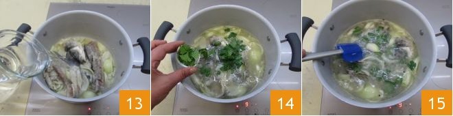 and once all the alcohol has evaporated, add the water gradually 13 to cover the fish scraps, then add the peppercorns and parsley leaves 14, then add a pinch of salt and let it simmer for 60 minutes on low heat 15.
