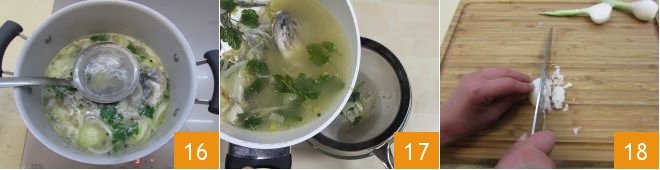 Occasionally skim with the help of a skimmer 16, always remembering to rinse the skimmer in clean water each time you repeat the operation. Once cooking is complete, strain the broth using a fine-mesh sieve 17, to remove the fish scraps used to flavor the stock. Now focus on the vegetables: chop the scallion 18,