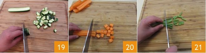 and proceed by cutting the zucchini into cubes of about half an inch 19, and the carrots 20. Also cut the green beans into small pieces of about 1 inch 21.