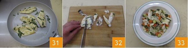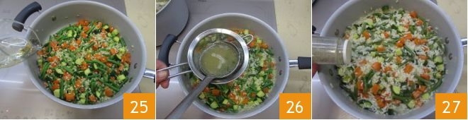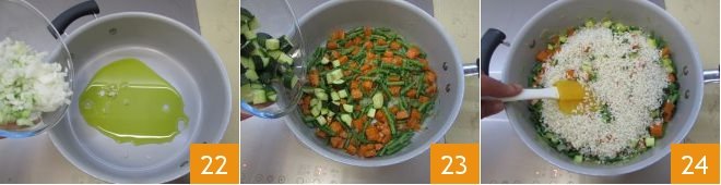 Then take a large frying pan, pour in the oil and then add the scallions 23, let them brown for a few minutes, and first the green beans and then the carrots. Then add the zucchini, and cook your vegetables for 3-4 minutes 24. Then pour in the rice 25,