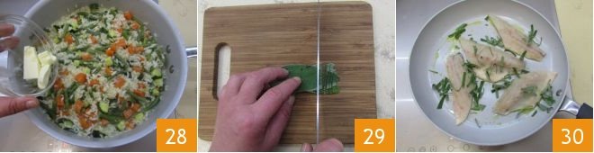 Only at the end of cooking, turn off the heat and add the butter to cream the risotto 28. While your risotto is cooking, cut the sage into strips with a knife 29, and place them in a pan with a drizzle of oil and the sea bass fillets 30.