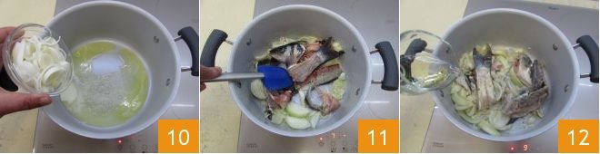 Now prepare the Fish Stock, which you will use to cook the risotto: clean and peel an onion and cut it into quarters, then take a leek, remove the ends and green leaves, and cut it into rings. In a pot, melt the butter, then add the leek, onion, the garlic 10 and let them wither for about 5 minutes. Add the fish scraps 11 and let them brown for a couple of minutes, this way the base will become flavorful; remember to stir continuously so that the fish does not stick to the pot. Deglaze with the white wine 12,