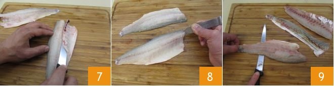 Remove the central bone from the flesh 7 and use tweezers to remove any remaining bones 8. Then, remove the skin from the sea bass with a very thin knife, sliding it parallel to the fillet 9, and set aside both the fillets and the fish scraps, namely the head, central bone, and fins.