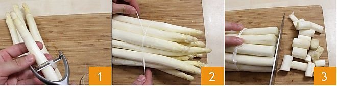 To prepare the risotto with white asparagus cream, wash the asparagus under running water, then scrape away the tougher outer part 1 (without touching the tips), tie the asparagus with kitchen string 2, cut off the woody part at the end 3, and if necessary, even them out with the help of a knife or a peeler. (for all details, refer to the Cooking School How to clean asparagus)