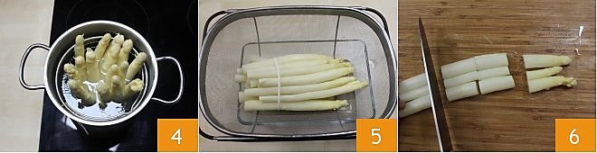 then simmer them for about 20 minutes in salted water in a tall and narrow pot 4, from which only the tips should protrude, which will cook with the steam from the water itself. After 20 minutes, remove the asparagus from the water and let them drain 5, then as soon as they are lukewarm, cut off the tips 6, set them aside and cut the stalks into pieces.