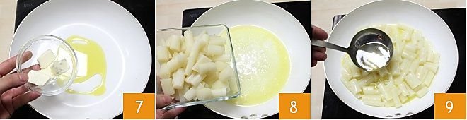 In a pan, place 2 tablespoons of oil and 20 grams (0.7 oz) of butter 7, then add the chopped asparagus stalks 8 and after a few minutes, stew them with a ladle of vegetable broth 9;