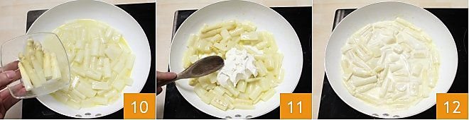 At mid-cooking, add half of the asparagus tips 10 (the other half will be used for the final seasoning), once the broth has evaporated, add the mascarpone 11, allow it to melt well 12