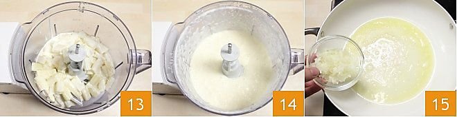 and then blend everything in a mixer 13 until you obtain a thick cream 14. In another large pan, place two tablespoons of oil, the remaining butter, add the onion 15 and let it soften for at least 10 minutes.