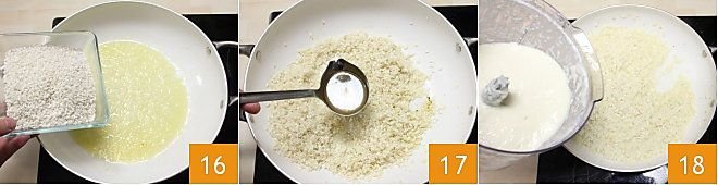 Add the rice, which you will toast for a few minutes 16; at this point, gradually add the vegetable broth 17, until fully cooked. Five minutes before the end of cooking, add the previously prepared white asparagus cream to the rice 18, adjust the salt and pepper;