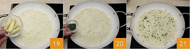 incorporate the reserved asparagus tips 19, turn off the heat and finally add the chopped parsley (20-21), mix well and serve the risotto with white asparagus cream immediately, sprinkling with grated Grana Padano DOP as desired.