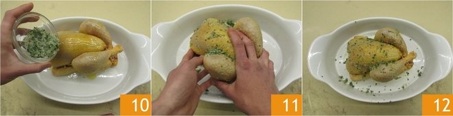 Cover with the aromatic mixture 10, massaging with both hands on all sides to make it adhere well 11. Also season the inside of the chicken with the aromatic mixture 12.