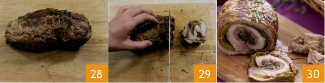 Then when it has cooled 28, take the roast and place it on a cutting board, slice it into slices about 1-1.5 inches thick 29. Your roast stuffed with figs and cured ham will then be ready to be served hot or warm 30 accompanied by the vegetable sauce!