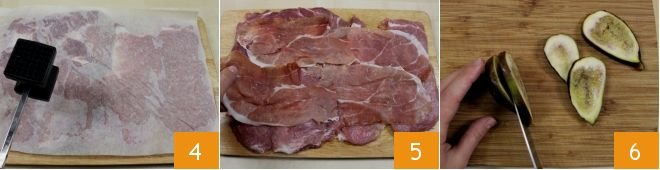 Then take the meat, place it on a cutting board, cover it with a sheet of parchment paper 4, and pound it with a meat mallet to make it thin and tender. Then remove the parchment paper and place the slices of prosciutto on the meat 5. Next, wash the figs and, with the skin on, cut them into slices about a quarter inch thick 6.