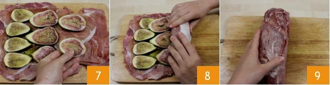 Also place the fig slices 7 creating a layer over the prosciutto, leaving about half an inch from the edge, then start rolling the roast tightly 8, gently to avoid the filling from spilling out, until it is completely closed 9.