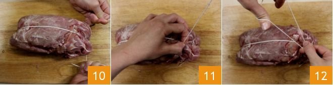 Now proceed to tie the roast with kitchen twine. For this operation, you can consult the cooking school: How to tie a roast. Pass the twine first under and then over the meat 10, along the length, securing the ends of the string tightly at the end 11 and leaving one part of the twine slightly longer. To form the cage, take the twine and create a loop, holding the base of it with your fingers, insert your hand into the loop 12.