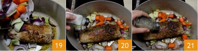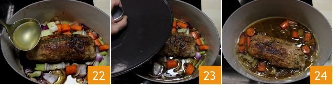 Pour in the vegetable broth 22 (find the Vegetable broth guide here) and cook with the lid on 23 on low heat for one and a half hours, turning the roast occasionally. Once the necessary time has elapsed, uncover it and turn off the heat 24.