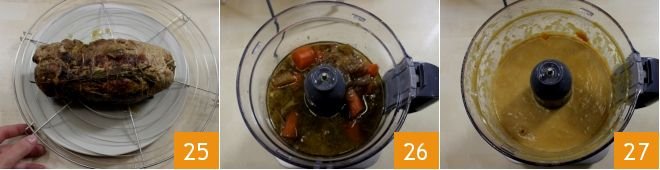 Remove the roast to a wire rack and let it cool slightly 25; pour the cooking base into a mixer to blend it 26 and obtain a thick sauce 27 that you will use as a side.