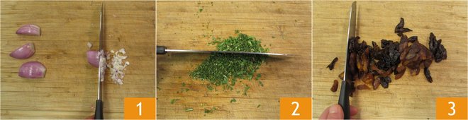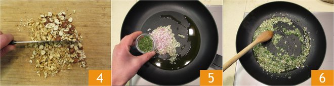 Chop the nuts 4. In a non-stick pan, melt the butter with the chopped shallot, add the aromatic herbs 5 and let them flavor for a few moments 6.