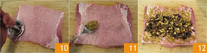 Slightly pound it 10 and spread the old-style mustard on the meat 11, add just a pinch of salt and pepper, sprinkle with the cooled filling 12.