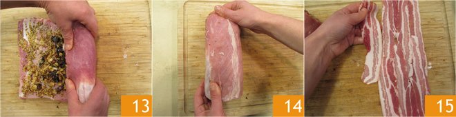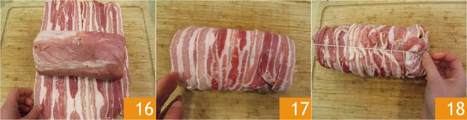 Place the roll on top 16 and wrap the surface, including the sides 17. Tie the roast with string 18.