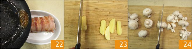 Transfer the roast to a baking dish with its cooking juices 22. Bake in a static oven, preheated to 392°F, for about 50 minutes, turning halfway through cooking. Meanwhile, cut the potatoes into wedges 23, clean the mushrooms and quarter them 24.