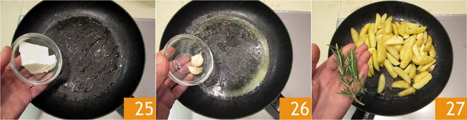 In a pan, melt the butter 25 and flavor it with garlic 26. Add the potatoes and rosemary 27. Sauté the potatoes until golden.
