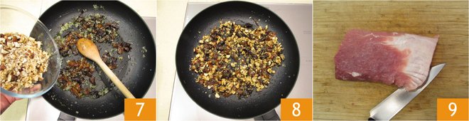 Add the dried and dehydrated fruit 7 and toast until golden 8. Let cool slightly and meanwhile open the loin by cutting with a sharp knife to obtain a large single slice 9.