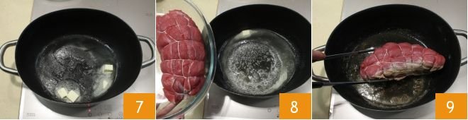 Now place a large saucepan on the stove, melt 2 tablespoons (30 g) of butter 7, place the roast 8, and brown the meat on all sides 9.
