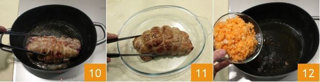 When the meat is well browned 10, remove it from the saucepan and place it in a bowl 11. In the same saucepan, melt the remaining butter and let the finely chopped onion, celery, and carrot simmer with the mixer 12;