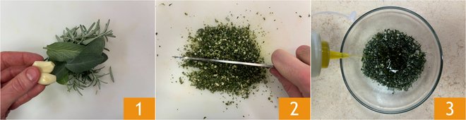 To prepare the roasted guinea fowl, first finely chop 2 peeled garlic cloves, a sprig of rosemary, and 3 sage leaves 1 2. Transfer everything to a bowl and season with the oil 3.