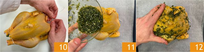 Wrap the string around the wings and knot it at the top 10, this way the guinea fowl will keep its shape during cooking. Place the guinea fowl on a baking sheet lined with parchment paper, pour the chopped herbs over the guinea fowl 11, and massage the meat 12 to distribute the herbs over the entire surface. Bake in a preheated, fan-assisted oven at 356°F for 20 minutes.