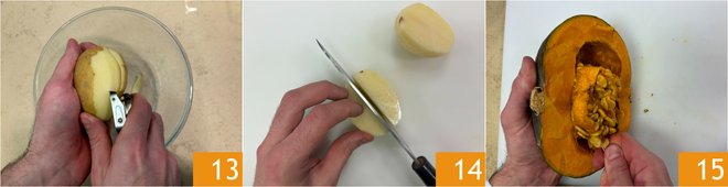 Meanwhile, peel the potatoes 13 and cut them into wedges 14. Remove the seeds and internal filaments from the pumpkin 15.