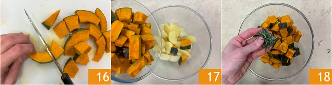 Then cut it into 1-inch cubes 16. Transfer potatoes and pumpkin to a bowl 17, then season with rosemary 18.