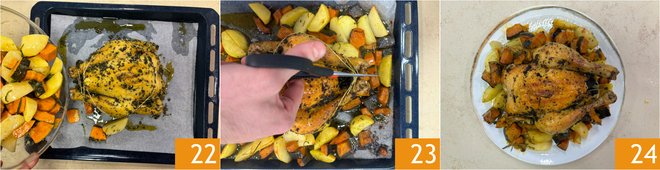 Add the vegetables to the baking sheet, along with the guinea fowl 22, cut the string 23, and continue cooking under the same conditions for another 40 minutes. Remove from the oven, let the guinea fowl rest for 10 minutes, then plate it. Your roasted guinea fowl is ready to be served 24!