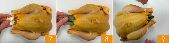 Stuff the guinea fowl with two more crushed garlic cloves 7, three sage leaves 8, and a sprig of rosemary. Tie the guinea fowl's legs with kitchen string 9.