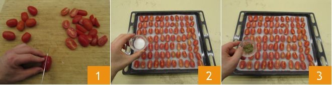 To prepare the roasted tomato pesto, start by briefly rinsing the tomatoes. After drying them, cut them in half 1 and place them on a baking sheet lined with parchment paper, with the cut side facing up. Sprinkle them with salt 2, sugar, and a bit of oregano, and bake in a preheated static oven at 464°F (240°C) for about 30 minutes 3.