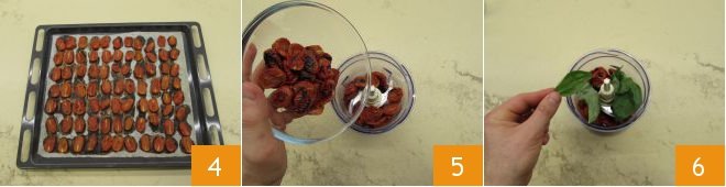 Don't worry, the parchment paper will look burnt due to the liquids released by the tomatoes 4. The tomatoes themselves will be dry but still soft and probably with a bit of charred skin. Let them cool slightly before removing them and placing them in the blender 5. Add the basil leaves 6,
