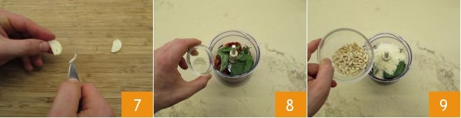 then peel, halve the garlic, and remove the core 7, then add it to the blender 8 along with the grated Parmesan and pine nuts 9.