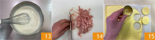 Stir over low heat for 5-6 minutes until reaching the desired consistency 13. Set the béchamel aside and chop the cooked ham into pieces 14. Take the semolina mixture and cut out discs using a 2-inch diameter round cutter 15.
