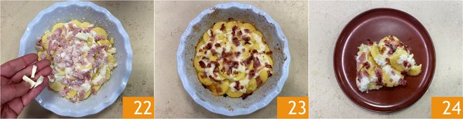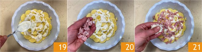 Cover the gnocchi with béchamel 19, then distribute the cooked ham 20 and finish with more grated Parmesan cheese 21.