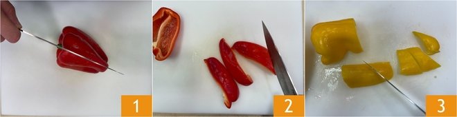 To prepare Roman-style chicken with peppers, first wash the peppers. Cut them in half 1 and remove the seeds and inner filaments. Slice the peppers 2 and then cut them into pieces 3.