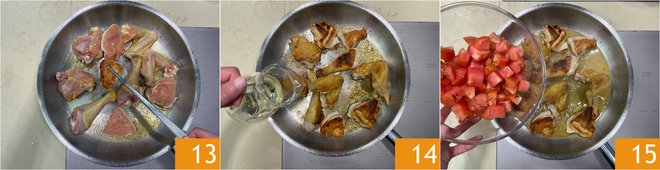 Then add the chicken pieces and, when they are well browned, turn them 13 and remove the garlic. Let them brown on the other side and deglaze with white wine 14. Once completely evaporated, add the tomatoes 15.