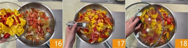 Also add the peppers 16, salt, pepper 17 and cover with a lid 18.