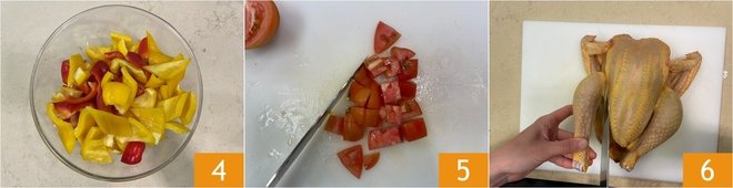 Collect the yellow and red peppers in a bowl 4. Dice the tomatoes 5. Now, take care of the chicken; you will need to cut it into pieces. If you are not very skilled, we recommend buying it already cut. Using a sharp knife, first separate the thighs 6.