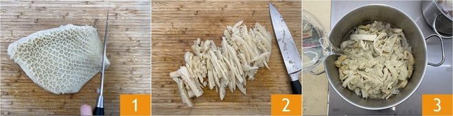 Remove the ham fat from the sauce 16. Add the sauce to the tripe 17, stir to blend and flavor 18. Continue cooking for another 20 minutes.