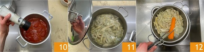 Salt 10 and cook for 20 minutes. Meanwhile, the tripe will be cooked 11, drain it, and remove the carrot and onion 12.