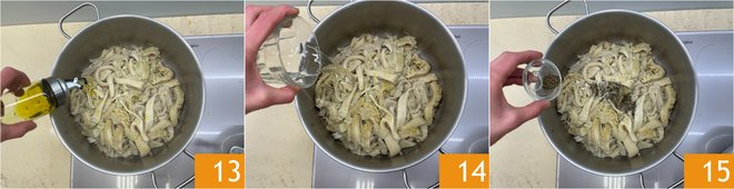 Pour the oil 13, the wine 14, and flavor with dried mint 15. Let it sizzle for a few moments, stirring.