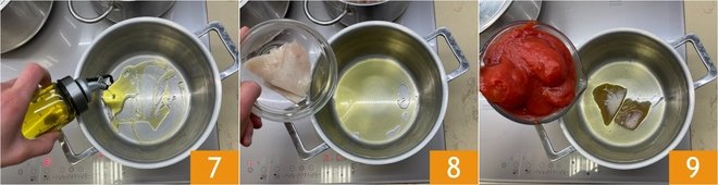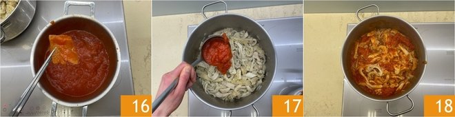 In the meantime, prepare the sauce: in another pot, pour a bit of oil, add the ham fat and let it fry 8. Then add the peeled tomatoes 9.
