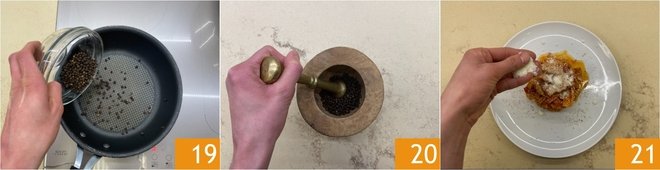 Separately, in a hot pan, toast the peppercorns 19, then crush them with a mortar 20. Serve the Roman-style tripe with grated Pecorino Romano 21, a few leaves of Roman mint, and the toasted pepper.
