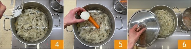 Add coarse salt 4, a carrot, and half an onion 5, cover with the lid and cook for 30-40 minutes over medium-low heat 6.